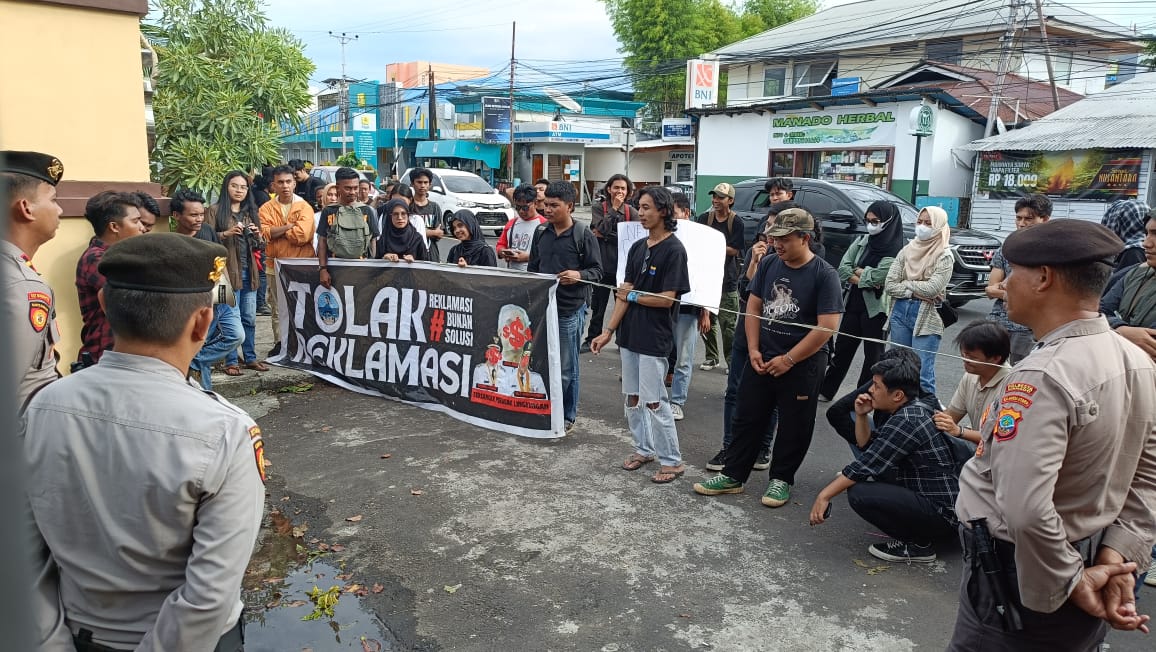 Massa juga membawa spanduk yang bertuliskan “Tolak Reklamasi dan Reklamasi Bukan Solusi” serta gambar salah satu pimpinan perusahaan reklamasi, Agus Abidin, serta menulis nama Gubernur Sulut dan Walikota Manado sebagai tersangka perusak lingkungan.