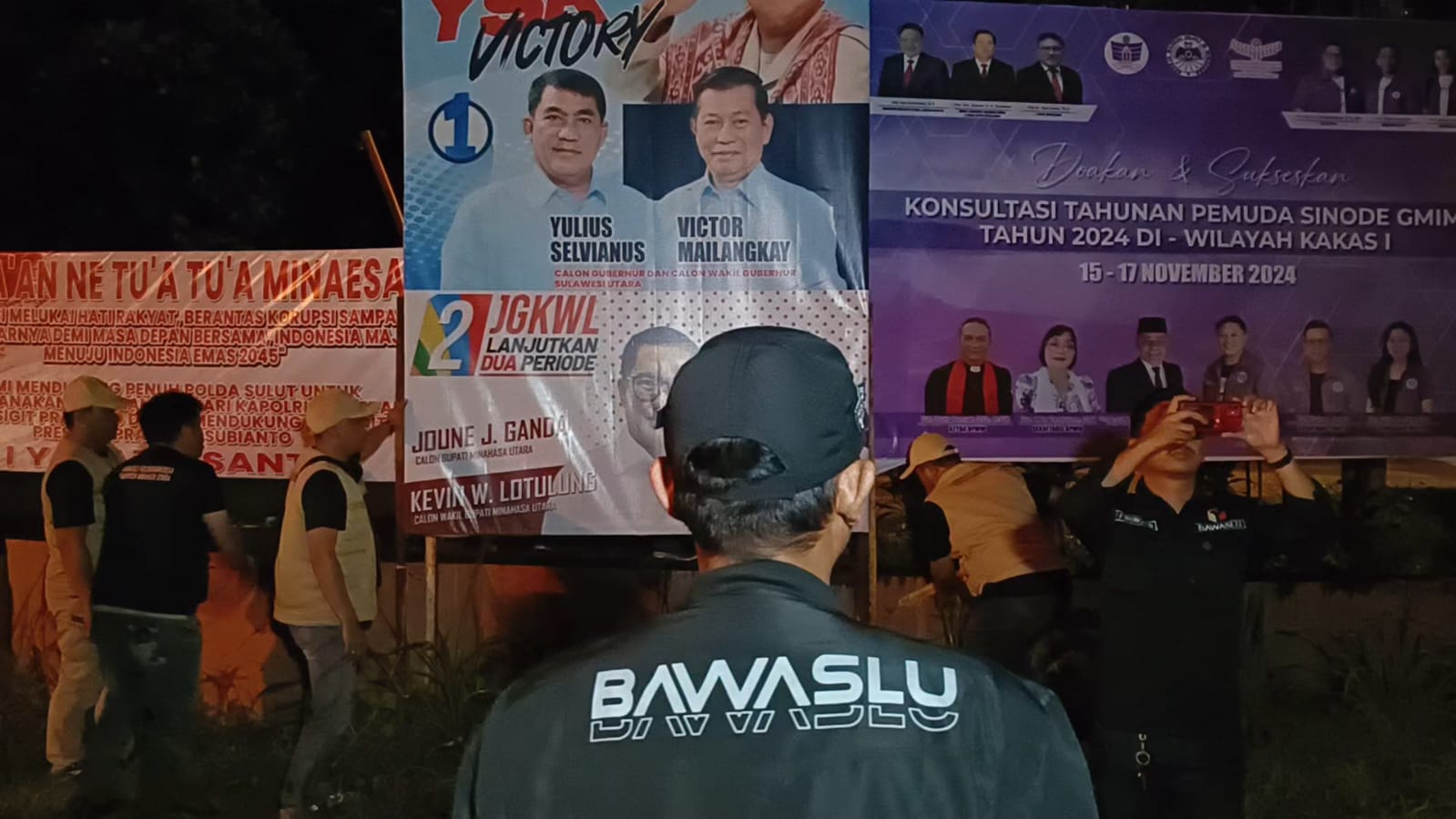 MANADO, TR – Badan Pengawas Pemilihan Umum (Bawaslu) Provinsi Sulawesi Utara (Sulut) melakukan penertiban alat peraga kampanye (APK) pada Sabtu dini hari, 24 November 2024.