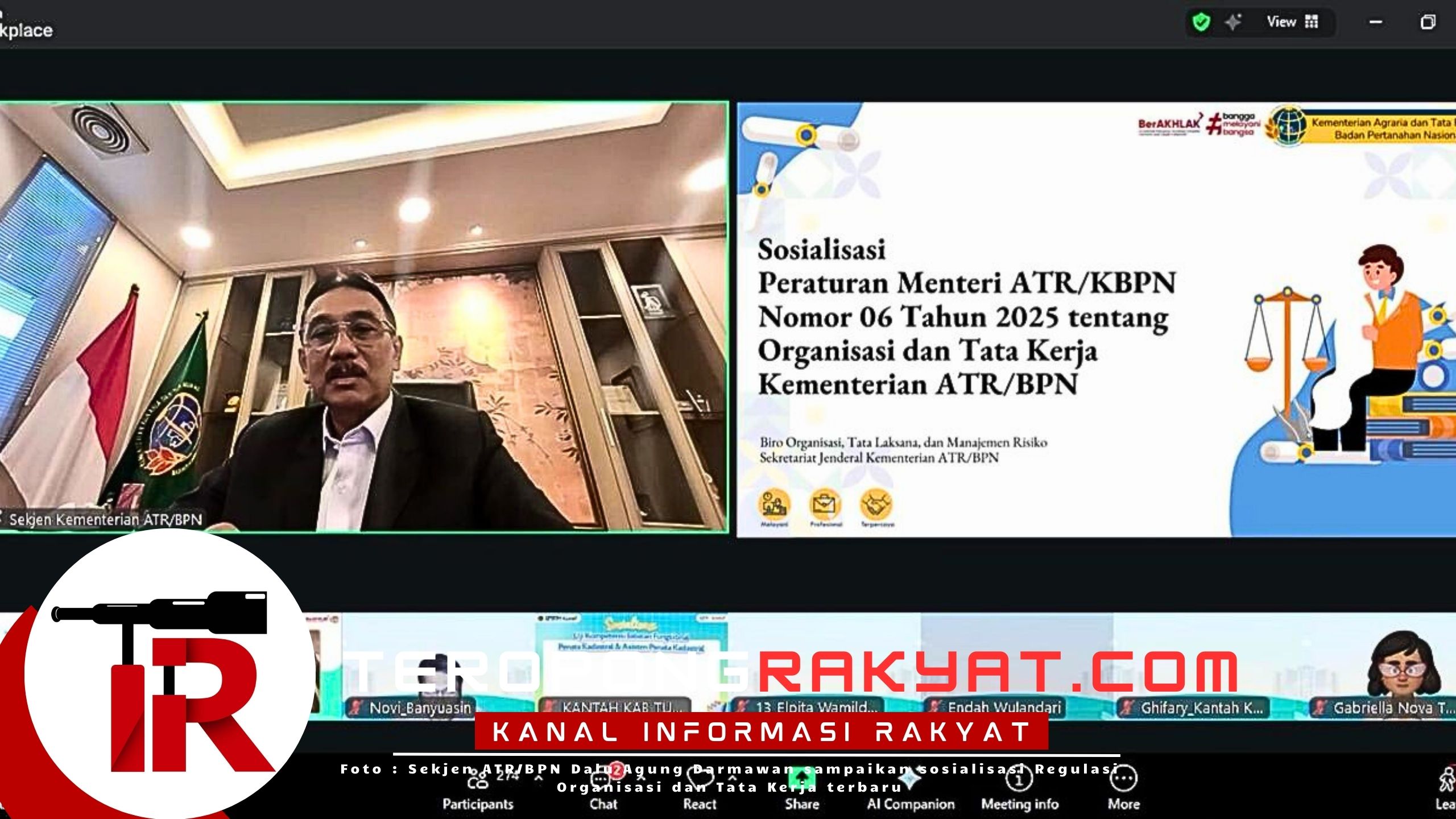 Jakarta, TR – Kementerian Agraria dan Tata Ruang/Badan Pertanahan Nasional (ATR/BPN) tengah memperkuat struktur internal melalui sosialisasi Regulasi Organisasi dan Tata Kerja terbaru. Sekretaris Jenderal Kementerian ATR/BPN, Dalu Agung Darmawan, memimpin langsung agenda penting ini melalui Webinar Nasional pada Kamis (12/03/2026).